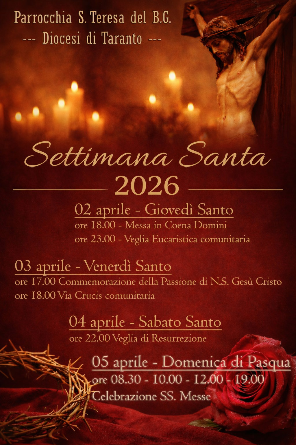 ore 17.30 Processione con il simulacro di S. Teresa del B.G. per le vie del quartiere: C. Battisti - Fiume - Venezia - Bari - Pisa - Plateja - Pola - C. Battisti – Campioni.